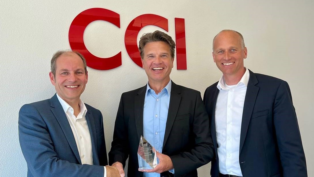 Ralf Bauer (center), CGI’s Senior Vice-President for Germany Central and South, and Marco Burk (right), CGI Vice-President, Marketing and Communications, for Scandinavia & Central Europe operations, receive the ISG Star of Excellence award for achievements in “Universal Technology" from Andreas Fahr (left), ISG partner for the DACH region (Germany, Austria and Switzerland).